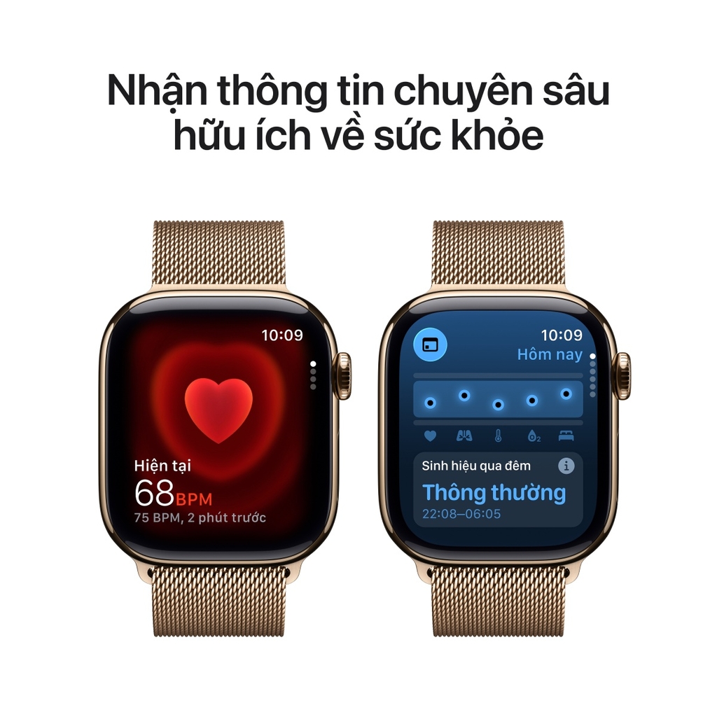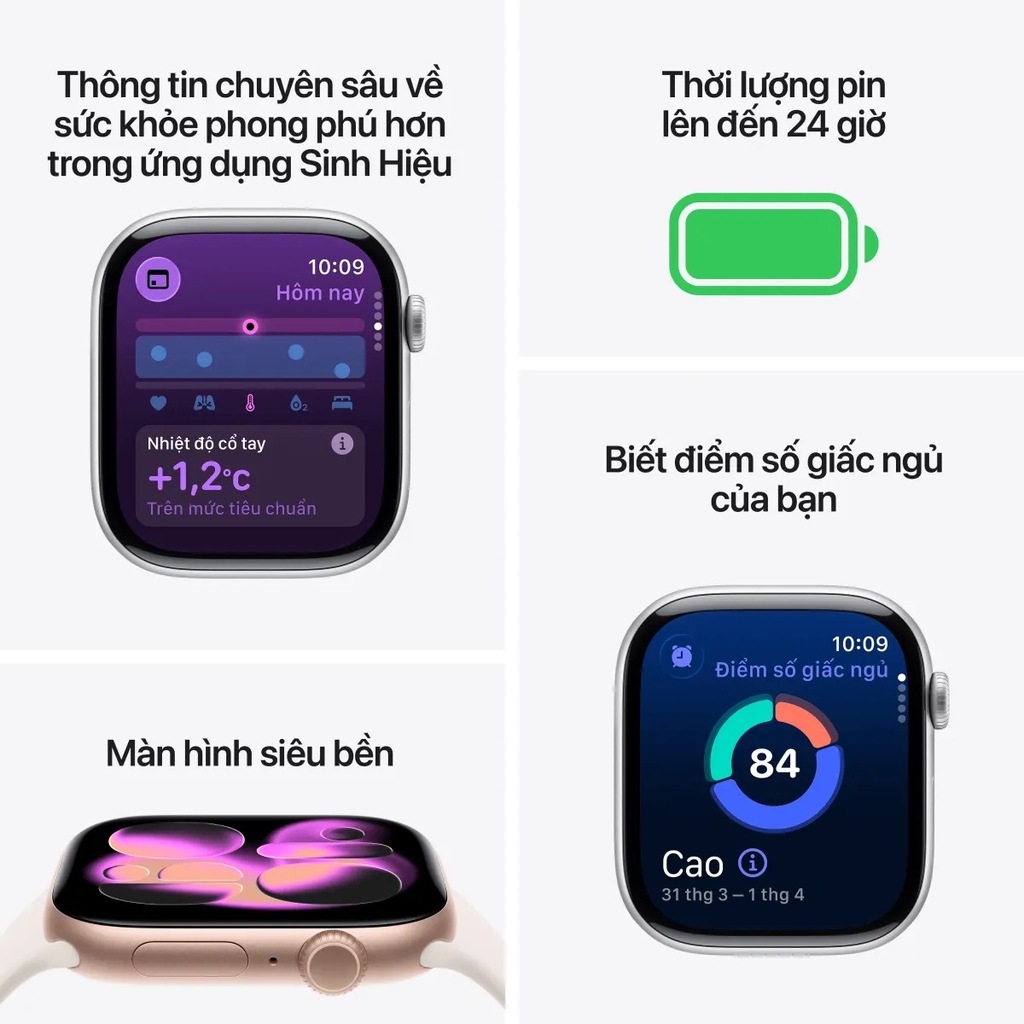 | Tiện ích sức khoẻ | Chế độ luyện tập, Theo dõi giấc ngủ, Đo nhịp tim, Đo lượng oxy trong máu, Đếm bước chân, Tính calo tiêu thụ, Tính quãng đường chạy, Đo mức độ stress, Cảm biến nhiệt độ, Phát hiện té ngã, Cảnh báo nhịp tim bất thường, Đo điện tâm đồ, Đo VO2 max (Đo lượng tiêu thụ oxy tối đa), Theo dõi chu kỳ, Nhắc nhở ít vận động, Phát hiện chứng ngưng thở khi ngủ |
